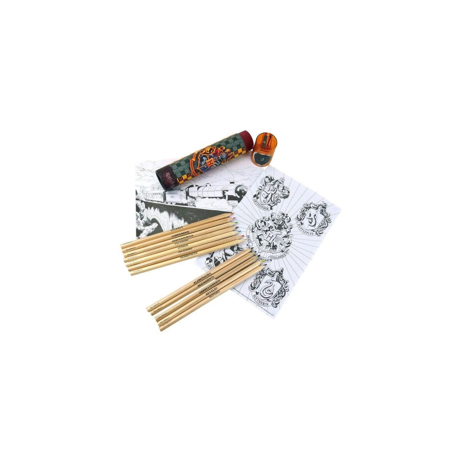 - Set de 12 lápices de colores con el nombre de diferentes hechizos.
