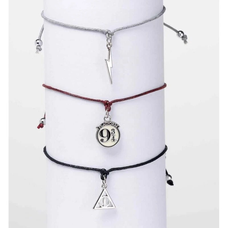 - Set de pulseras de Harry Potter, con las Reliquias de la muerte, la plataforma 9 3/4 y el rayo de la cicatriz.
