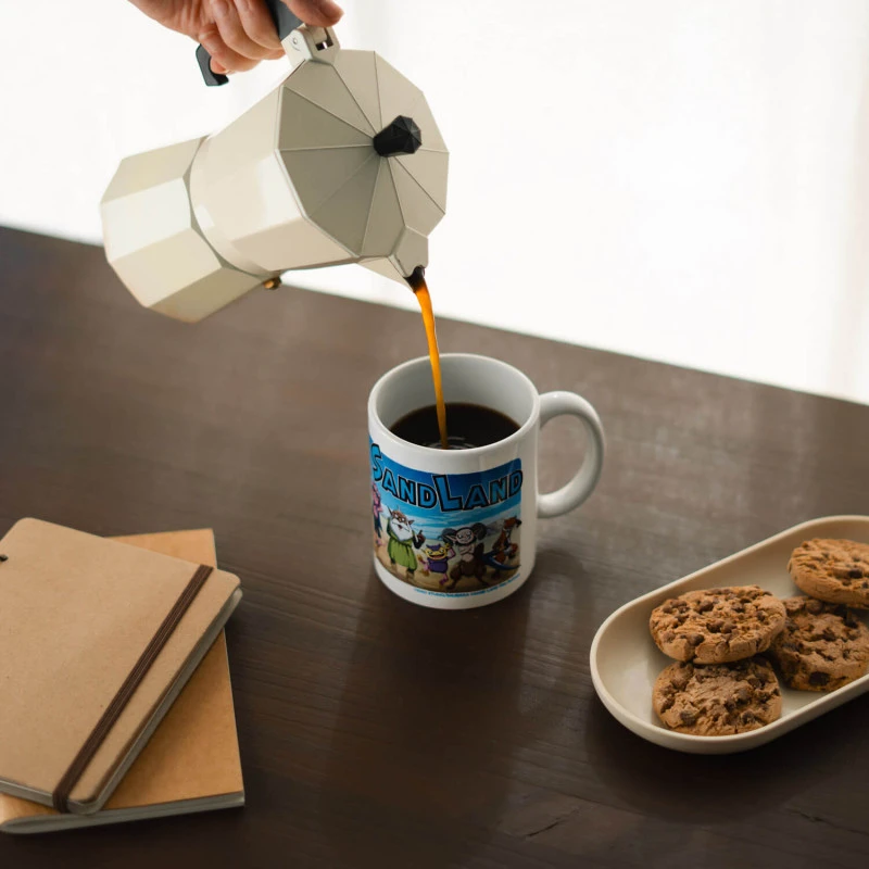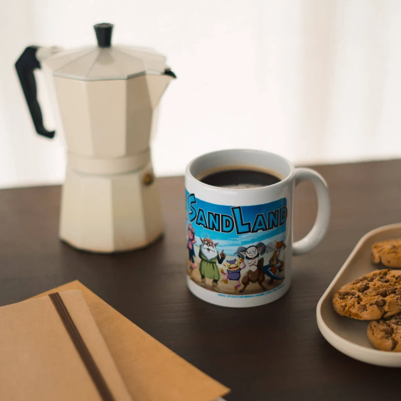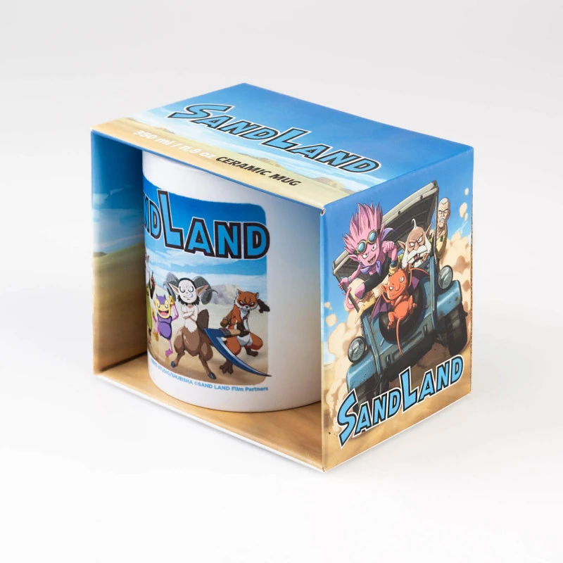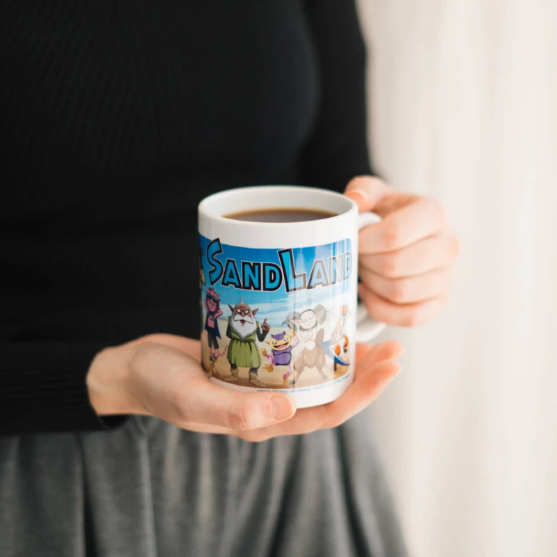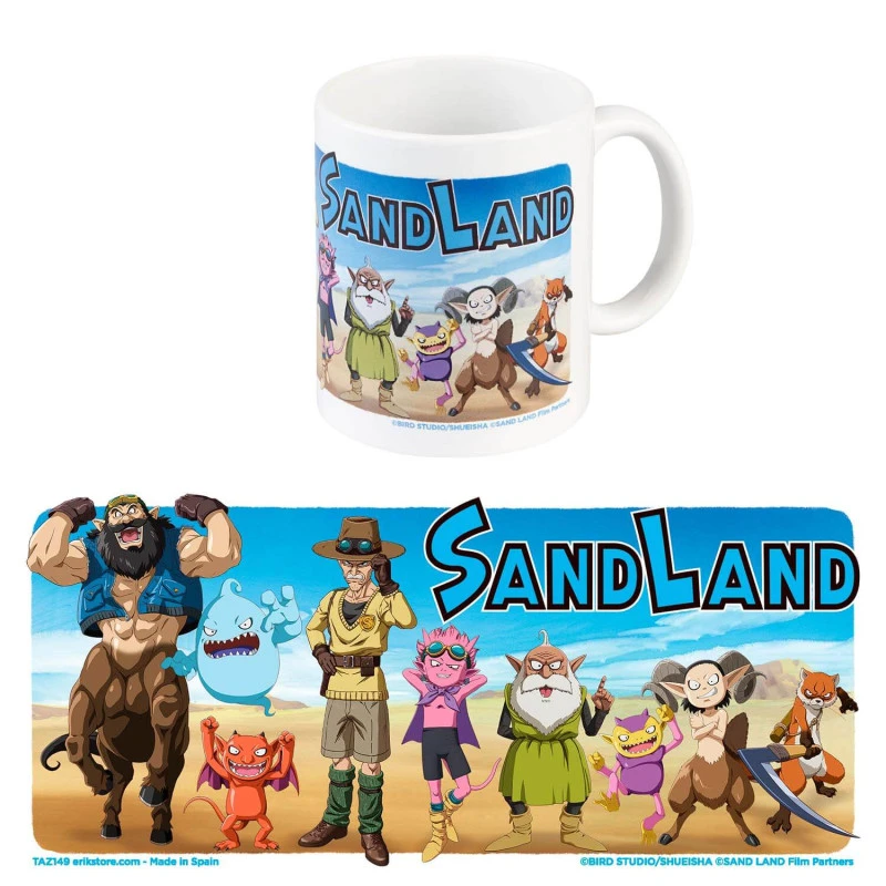 Esta taza de Sand Land tiene capacidad para 350 mililitros y está fabricada en cerámica. Mide 10 cm de alto por 8 cm de diámetro y es apta para lavavajillas y para microondas. Viene protegida dentro de una caja de cartón.