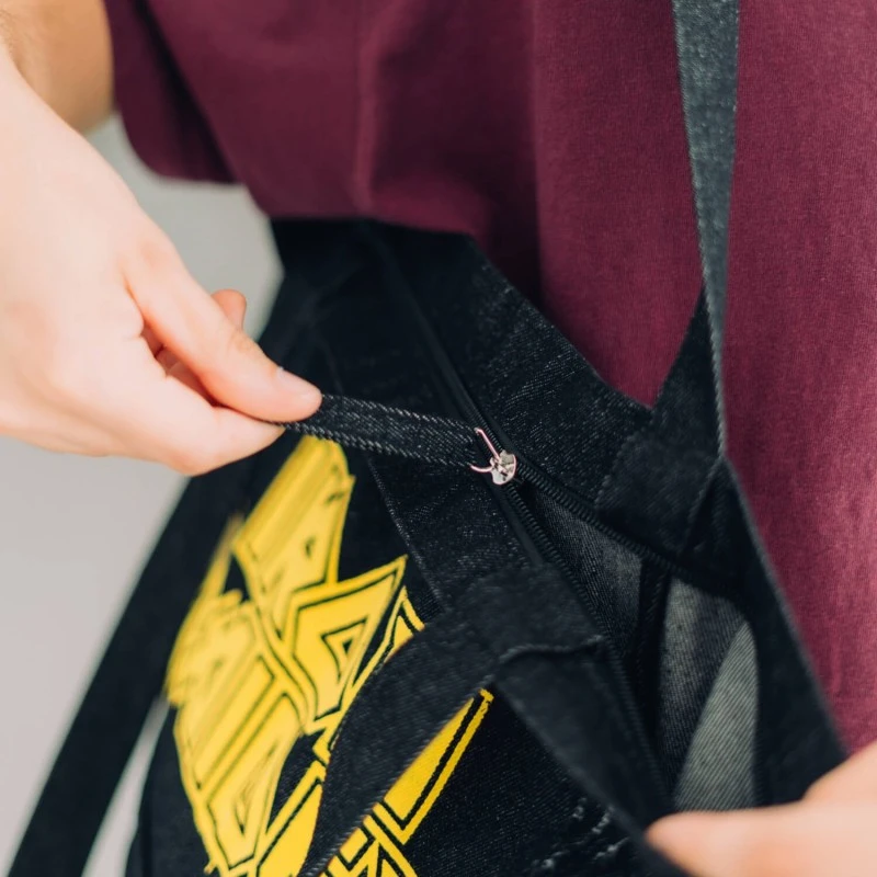 Está fabricada en algodón 100% y cuenta con dos asas para llevarla cómodamente al hombro y cierre por cremallera. Además, tiene un pequeño bolsillo interno y dos bolsillos exteriores, uno de ellos con cierre metálico.
