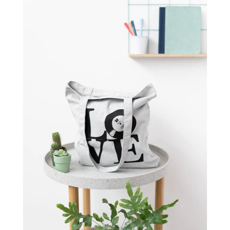 Fabricada con materiales textiles reciclados. Pon tu granito de arena para cuidar el medio ambiente y cambia las bolsas de plástico por esta bolsa de tela reutilizable.