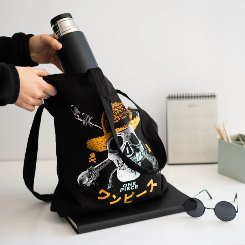 Esta tote bag de One Piece está inspirada en la serie live action de Netflix y es el bolso de tela ideal para el día a día, ya que te permite llevar todas tus cosas siempre a mano donde quiera que vayas. Está fabricada en algodón 100% y cuenta con dos asas para llevarla cómodamente al hombro. Respecto a su tamaño, tiene unas medidas de 37 x 39 x 5 cm.